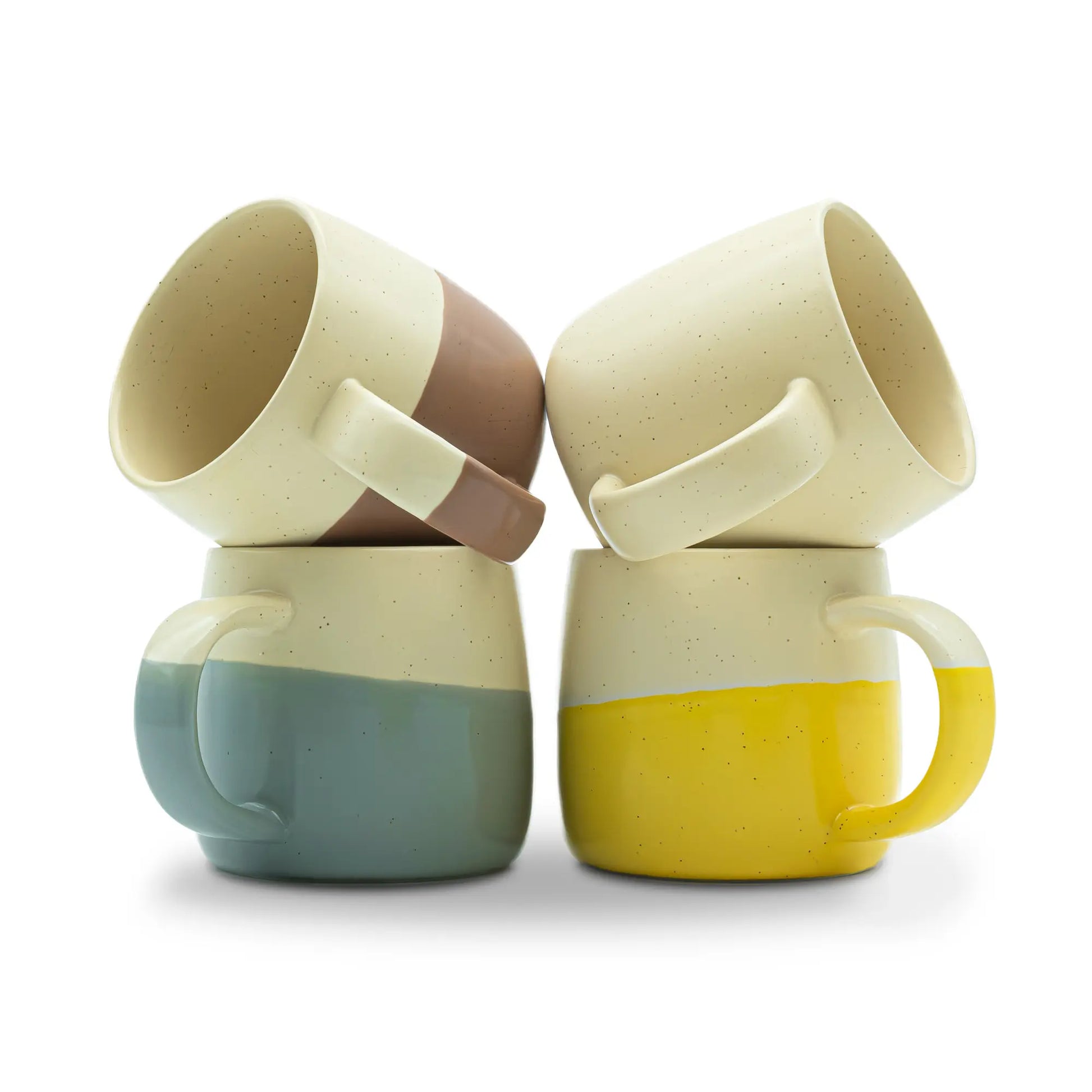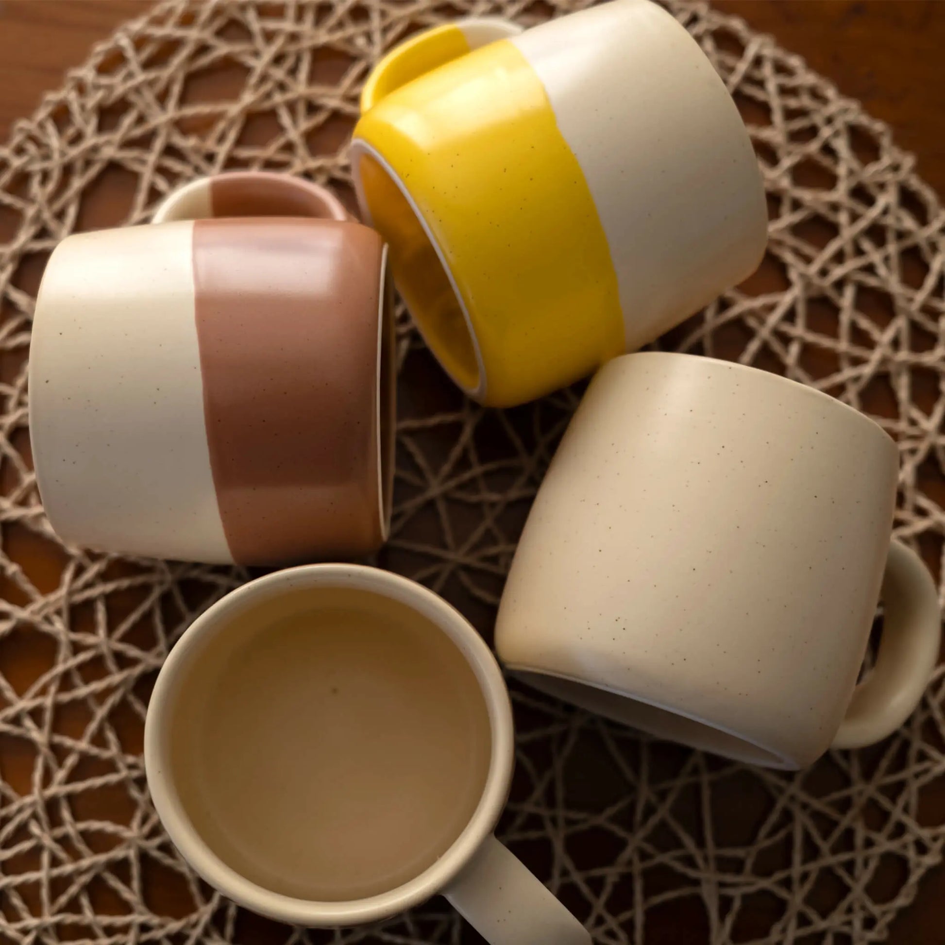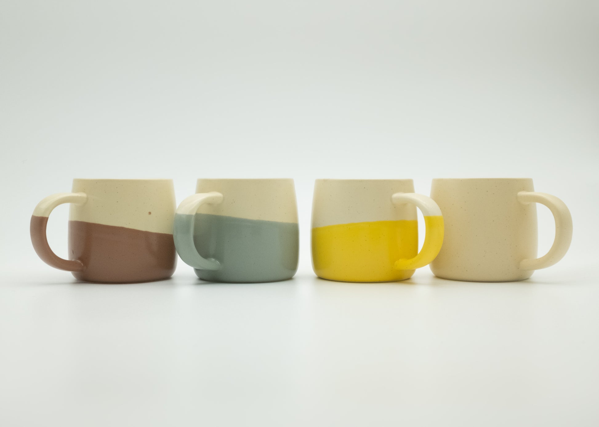 Das Modell ist erhältlich in verschieden Farben und ist im weissen Bereich leicht gepunktet. Mit dem leicht unebenen Übergängen bietet sie einen naturalen, handgemachten Look. Die Farben erinnern uns an die Umwelt: Wähle zwischen Gelb wie der Sonnenaufgang, Blau wie das Meer, Braun wie die Erde oder bleibe beim einfarbigen Weiss.
